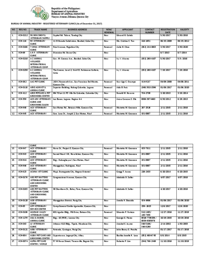 Registered Veterinary Clinics As Of December 31 2017 Animals And