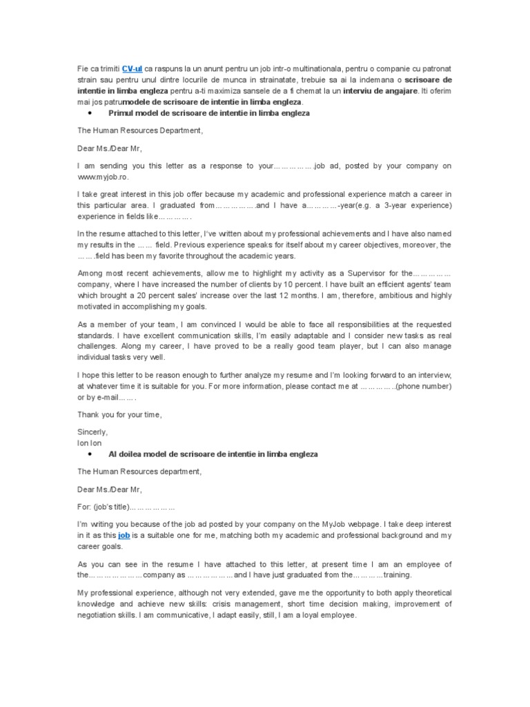 Modele De Scrisoare De Intentie In Limba Engleza Internship